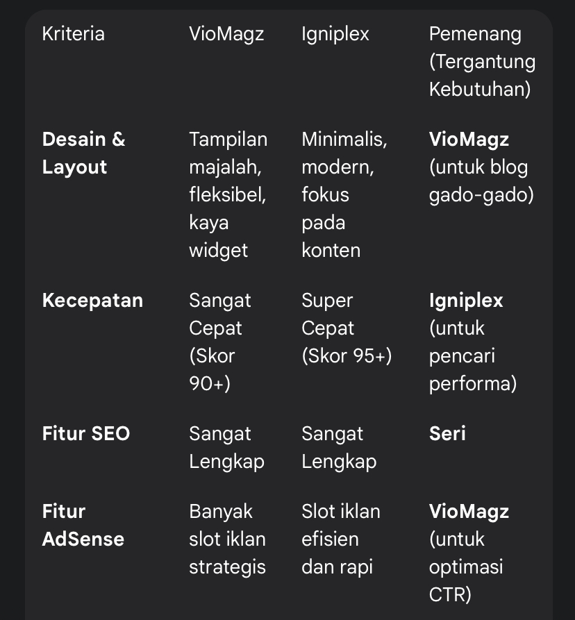 Di dunia blogging Indonesia, ada dua nama yang selalu menjadi buah bibir saat membahas template Blogger premium: VioMagz dan Igniplex. Keduanya adalah mahakarya